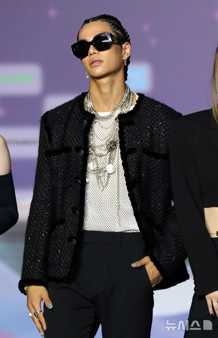 [고양=뉴시스] 김혜진 기자 = 그룹 올데이 프로젝트 타잔이 26일 오후 경기 고양 일산서구 킨텍스에서 열린 2025 SBS 가요대전 써머(Summer) 블루카펫에서 포즈를 취하고 있다.