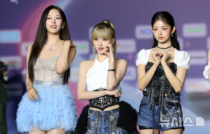 [고양=뉴시스] 김혜진 기자 = 그룹 아이브 유진(왼쪽부터), 가을, 레이가 26일 오후 경기 고양 일산서구 킨텍스에서 열린 2025 SBS 가요대전 써머(Summer) 블루카펫에서 포즈를 취하고 있다.