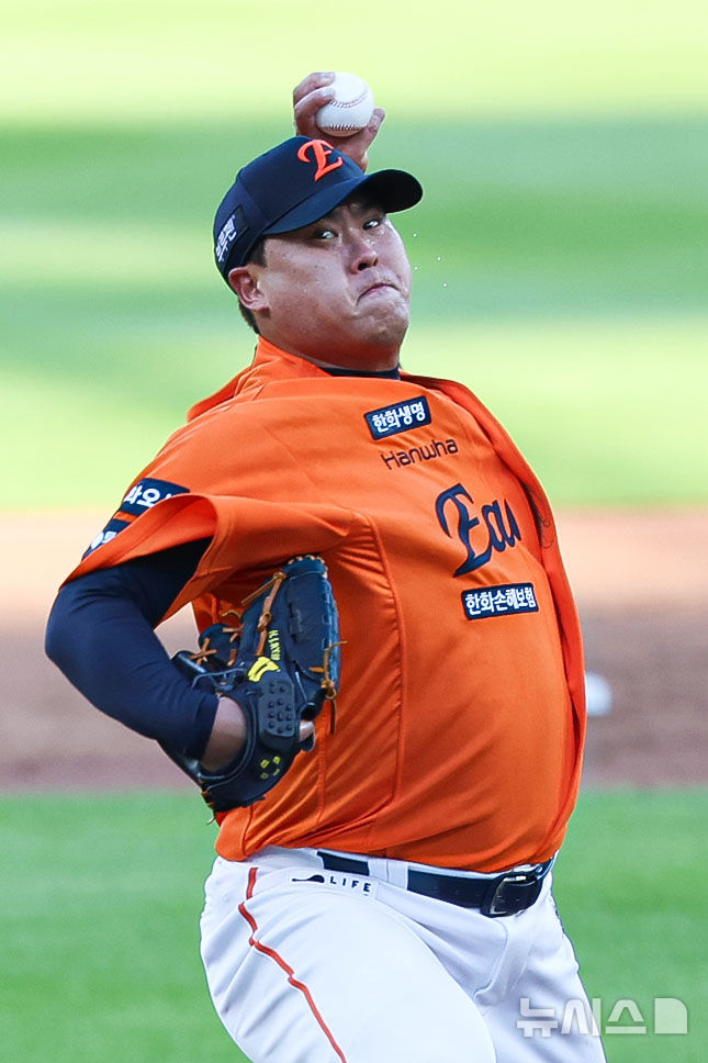 [대전=뉴시스] 권창회 기자 = 26일 오후 대전 중구 대전한화생명볼파크에서 열린 2025 신한 쏠뱅크 KBO리그 한화 이글스와 SSG랜더스의 경기, 1회 초 한화 류현진이 역투하고 있다. 2025.07.26. [email protected]