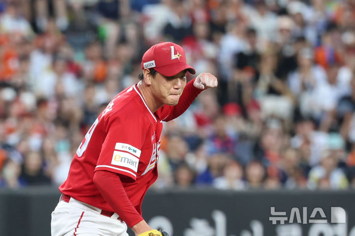 [대전=뉴시스] 권창회 기자 = 26일 오후 대전 중구 대전한화생명볼파크에서 열린 2025 신한 쏠뱅크 KBO리그 한화 이글스와 SSG랜더스의 경기, 5회 말까지 무실점 투구를 펼친 SSG 김광현이 주먹을 쥐며 기뻐하고 있다. 2025.07.26. [email protected]