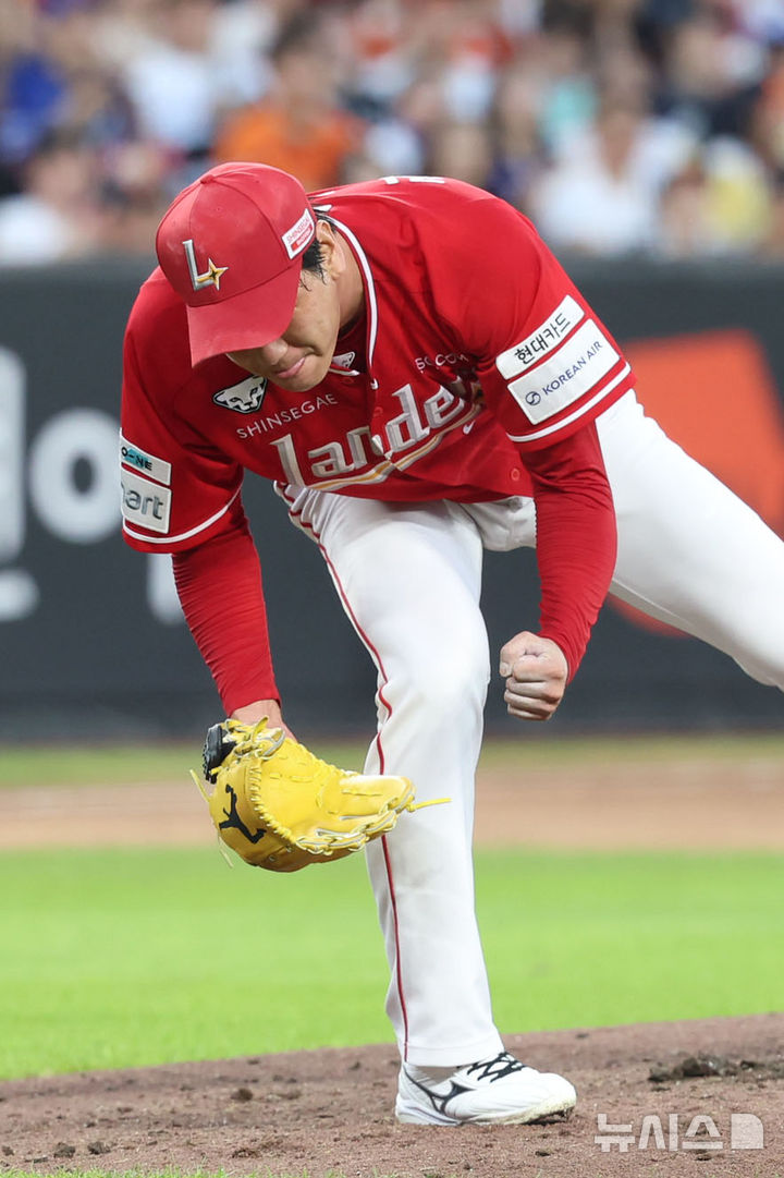 [대전=뉴시스] 권창회 기자 = 26일 오후 대전 중구 대전한화생명볼파크에서 열린 2025 신한 쏠뱅크 KBO리그 한화 이글스와 SSG랜더스의 경기, 5회 말까지 무실점 투구를 펼친 SSG 김광현이 주먹을 쥐며 기뻐하고 있다. 2025.07.26. [email protected]
