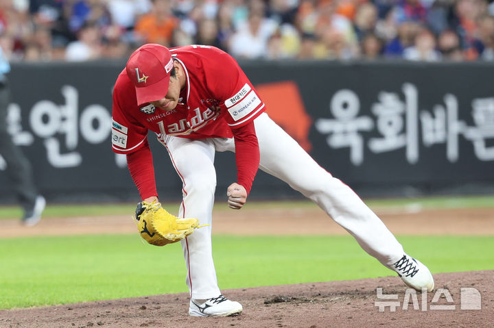 [대전=뉴시스] 권창회 기자 = 26일 오후 대전 중구 대전한화생명볼파크에서 열린 2025 신한 쏠뱅크 KBO리그 한화 이글스와 SSG랜더스의 경기, 5회 말까지 무실점 투구를 펼친 SSG 김광현이 주먹을 쥐며 기뻐하고 있다. 2025.07.26. [email protected]