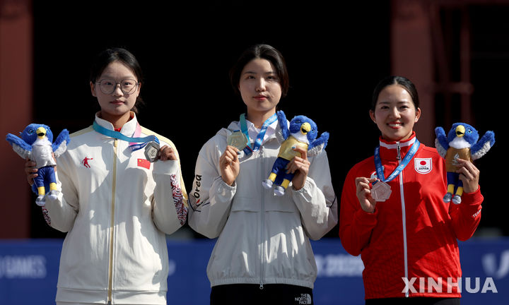 [에센=신화/뉴시스] 남수현(가운데)이 26일(현지 시간) 독일 에센에서 열린 2025 라인-루르 국제대학스포츠연맹(FISU) 하계 유니버시아드 양궁 여자 리커브 개인전 정상에 올라 시상대에서 금메달을 들고 기념 촬영하고 있다. 파리올림픽 금메달리스트 남수현은 결승에서 류옌슈(LIU Yanxiu, 중국)를 세트 스코어 7-3으로 물리치고 금메달을 목에 걸었다. 2025.07.27.
