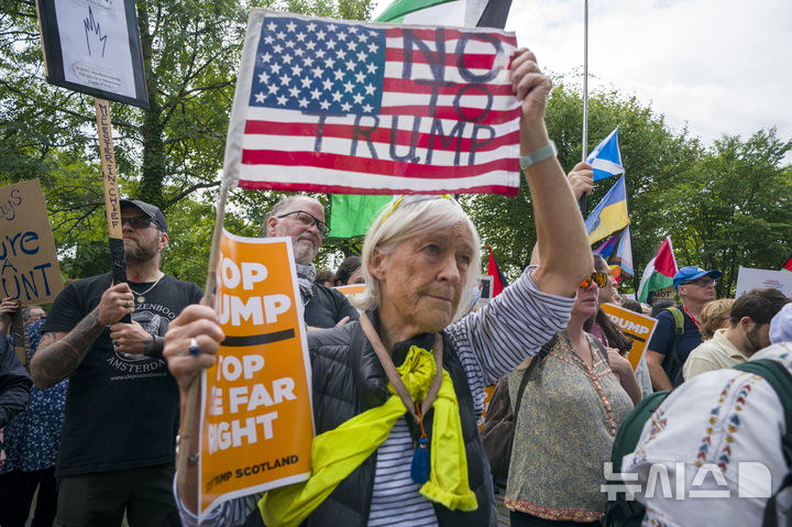 [에든버러=AP/뉴시스] 도널드 트럼프 미국 대통령이 스코틀랜드 사우스에어셔에 있는 본인 소유의 턴베리 골프클럽에서 5일간의 비공식 일정을 시작한 가운데 26일(현지 시간) 에든버러 주재 미국 영사관 앞에서 시민들이 '트럼프 스코틀랜드 방문 반대' 시위를 벌이고 있다. 2025.07.27.