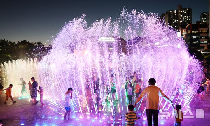 [부산=뉴시스] 하경민 기자 = 밤낮으로 푹푹 찌는 더위가 이어진 26일 밤 부산 사하구 다대포 꿈의 낙조분수를 찾은 어린이 등이 시원한 물줄기를 맞으며 더위를 식히고 있다. 2025.07.27. [email protected]