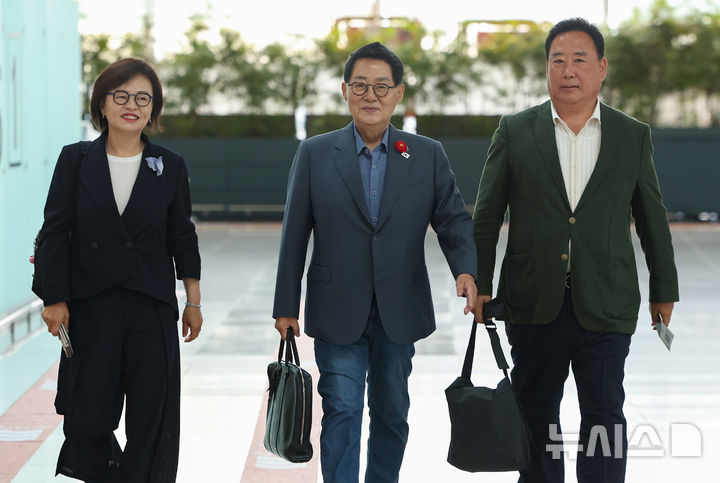 [인천공항=뉴시스] 황준선 기자 = 박지원(가운데) 폴란드 특사단장과 특사단원인 어기구(오른쪽), 진선미 더불어민주당 의원이 27일 오전 인천국제공항 제1터미널을 통해 폴란드로 출국하고 있다.