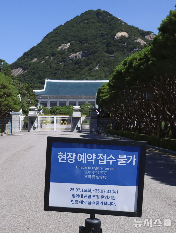 [서울=뉴시스] 김근수 기자 = 청와대 국민개방 마지막 주말인 27일 청와대 본관 앞에 현장예약 접수 불가 안내문이 놓여 있다. 2025.07.27. [email protected]