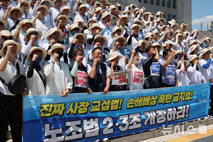 [서울=뉴시스] 김명년 기자 = 진보당, 민주노총서울본부 등 단체 회원들이 27일 오후 서울 여의도 국회 본청 앞 계단에서 '온전한 노조법 2,3조 개정 촉구 서울 노동자 기자회견'을 열고 있다. 2025.07.27. [email protected]