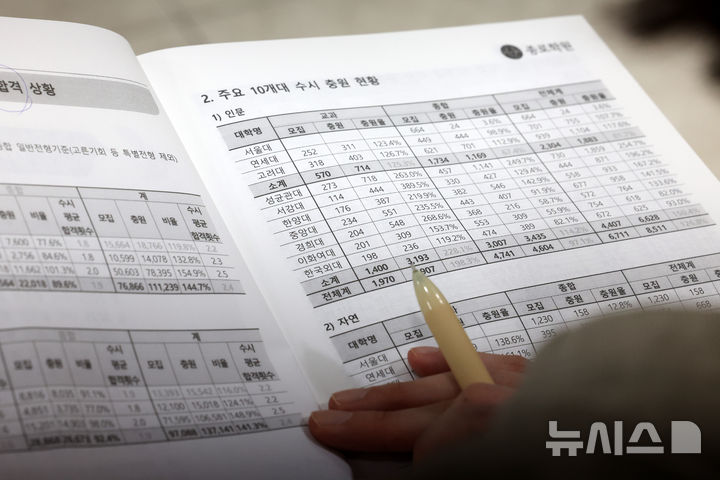 [서울=뉴시스] 배훈식 기자 = 2026 수시, 정시 대학 선택전략 특집설명회가 열린 27일 오후 서울 강남구 강남종로학원 대치에서 수험생을 둔 한 학부모가 입시 자료를 살피고 있다. 2025.07.27. [email protected]