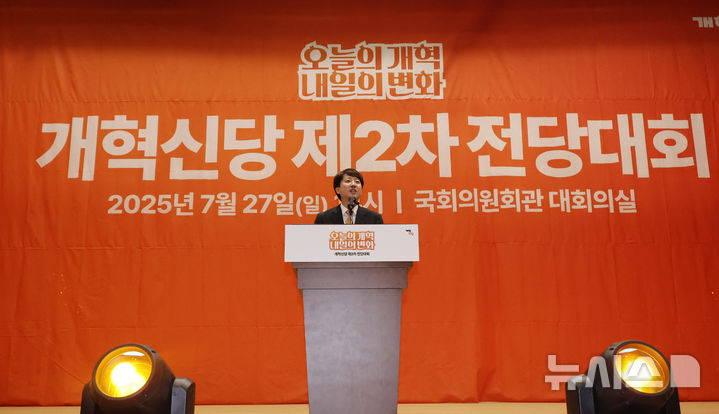 [서울=뉴시스] 김명년 기자 = 이준석 개혁신당 당대표 후보가 27일 오후 서울 여의도 국회 의원회관에서 열린 개혁신당 제2차 전당대회에서 정견을 발표하고 있다. 2025.07.27. [email protected]