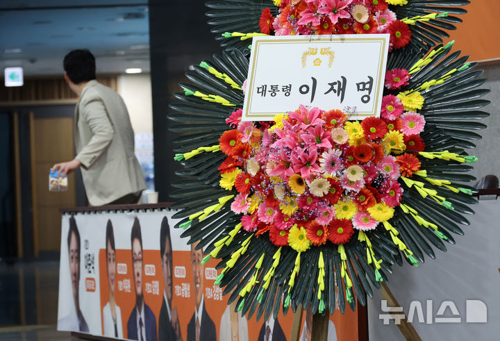 [서울=뉴시스] 김명년 기자 = 27일 오후 개혁신당 제2차 전당대회가 열리고 있는 서울 여의도 국회 의원회관 대회의실 앞에 이재명 대통령의 축하 화환이 놓여 있다. 2025.07.27. [email protected]