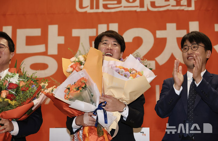 [서울=뉴시스] 김명년 기자 = 이준석 개혁신당 대표가 27일 오후 서울 여의도 국회 의원회관에서 열린 개혁신당 제2차 전당대회에서 꽃다발을 받고 환하게 웃고 있다. 2025.07.27. [email protected]