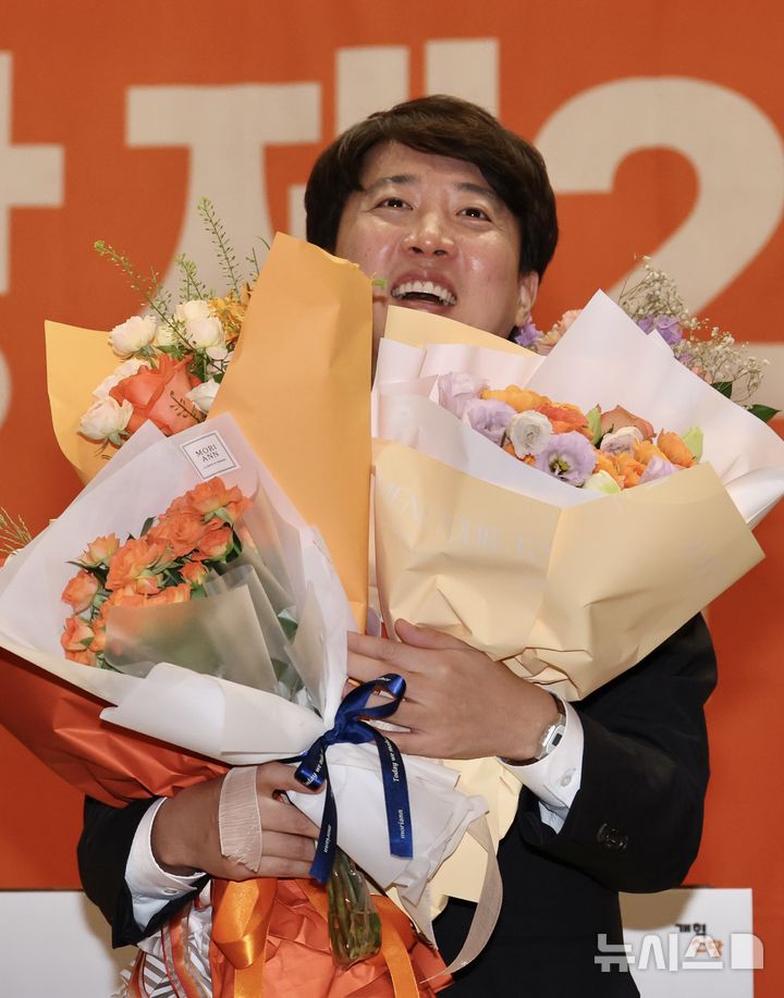 [서울=뉴시스] 김명년 기자 = 이준석 개혁신당 대표가 27일 오후 서울 여의도 국회 의원회관에서 열린 개혁신당 제2차 전당대회에서 꽃다발을 받고 환하게 웃고 있다. 2025.07.27. [email protected]