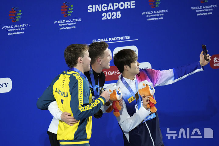 [싱가포르=AP/뉴시스] 김우민(오른쪽)이 27일(현지 시간) 싱가포르 세계수영선수권대회 아레나에서 열린 2025 세계수영연맹 세계선수권대회 경영 남자 자유형 400m에서 3분42초60의 기록으로 동메달을 따낸 후 시상대에서 금·은 수상자들과 셀카를 찍고 있다. 2025.07.28.