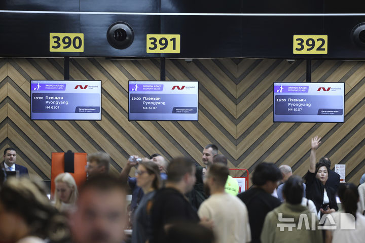 [모스크바=AP/뉴시스] 러시아가 모스크바-평양 직항 여객기 운항을 시작한 가운데 27일(현지 시간) 모스크바 외곽 셰레메티예보 국제공항에서 북한 평양행 첫 항공편 승객들이 탑승 수속을 하고 있다. 2025.07.28.