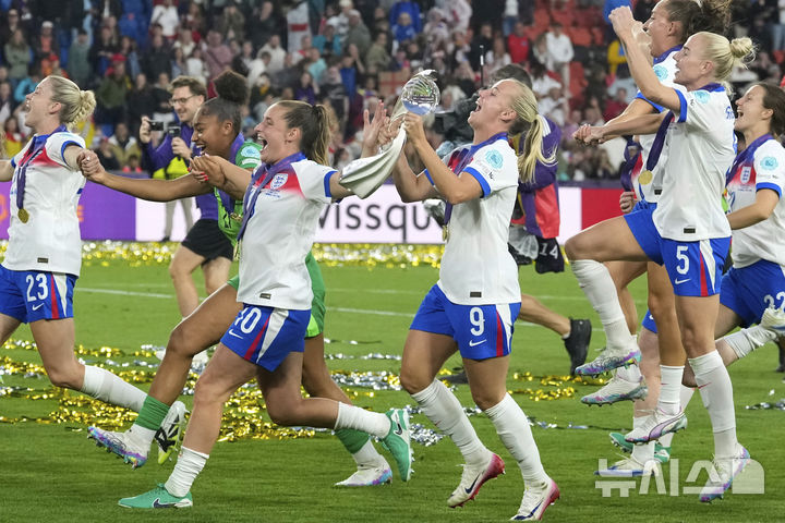 [바젤=AP/뉴시스] 잉글랜드 여자축구대표팀 선수들이 27일(현지 시간) 스위스 바젤의 장크트야코프파크에서 열린 2025 유럽축구연맹(UEFA) 여자 유로 정상에 올라 우승컵을 들고 환호하고 있다. '디펜딩 챔피언' 잉글랜드는 결승전에서 스페인과 1-1로 비겨 승부차기 끝에 3-1로 승리하고 2연패를 달성했다. 2025.07.28.