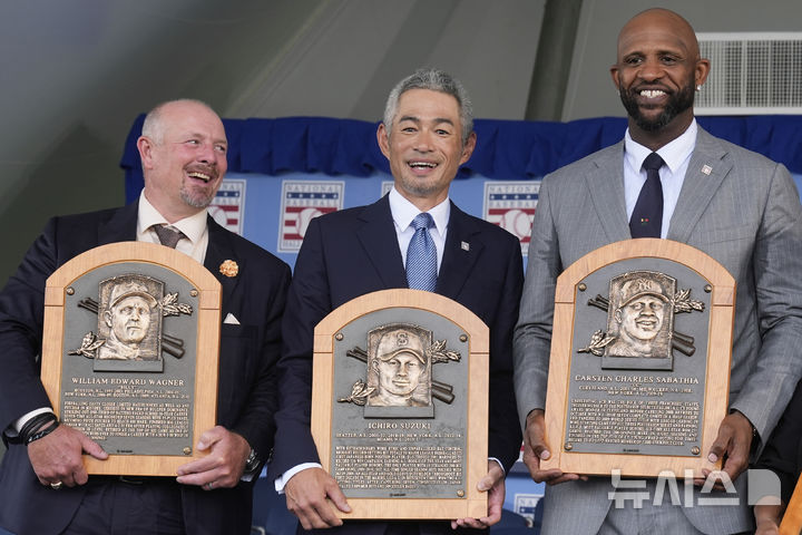 [쿠퍼스타운=AP/뉴시스] 스즈키 이치로(가운데)가 27일(현지 시간) 미 뉴욕주 쿠퍼스타운에서 열린 미국 야구 명예의 전당 헌액식에서 빌리 와그너(왼쪽), CC 사바시아와 함께 명판을 들고 포즈를 취하고 있다. 그는 "51세가 된 지금도 야구에서 멀어지지 않은 것이 행복하다"라고 소감을 말했다. 2025.07.28.