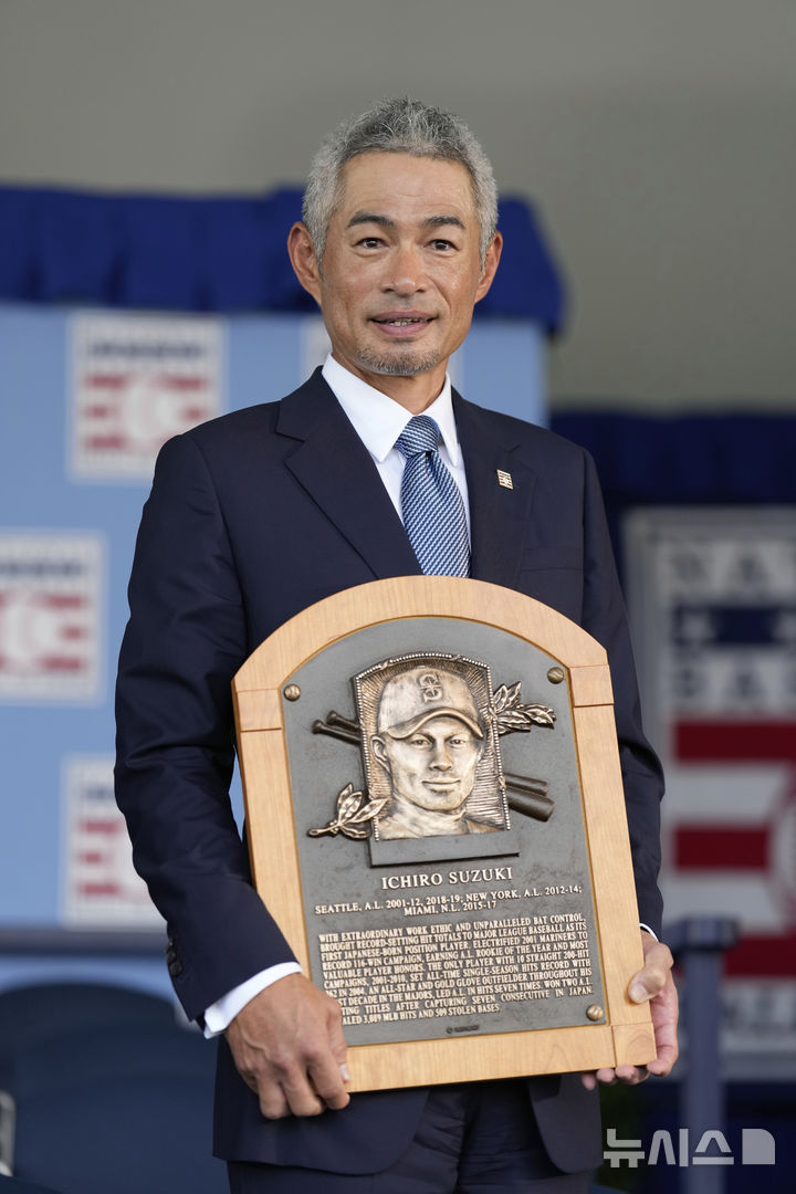 [쿠퍼스타운=AP/뉴시스] 스즈키 이치로가 27일(현지 시간) 미 뉴욕주 쿠퍼스타운에서 열린 미국 야구 명예의 전당 헌액식에서 본인의 명판을 들고 포즈를 취하고 있다. 그는 "51세가 된 지금도 야구에서 멀어지지 않은 것이 행복하다"라고 소감을 말했다. 2025.07.28.