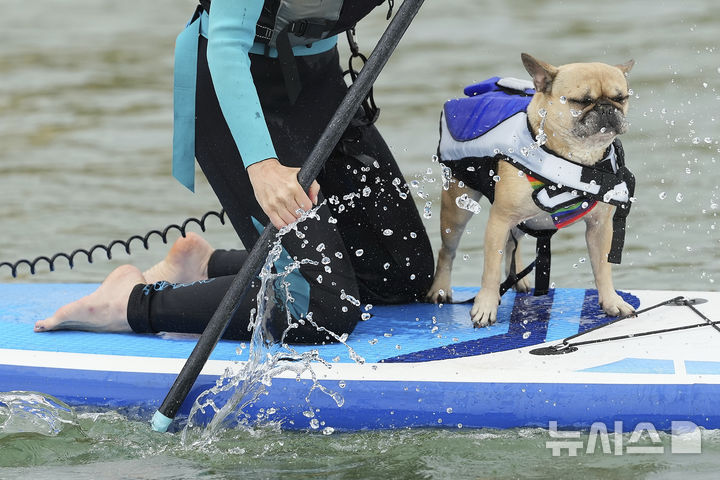 [풀=AP/뉴시스] 27일(현지 시간) 영국 도싯주 풀 인근에서 열린 '2025 도그 마스터스 페스티벌' 패들보드 대회에 한 여성과 반려견이 참가하고 있다. 이 대회는 '사람과 반려견 패들보드', '반려견 단독 서핑', '기네스 기록 도전' 등의 부문으로 나뉘어 열린다. 2025.07.28.