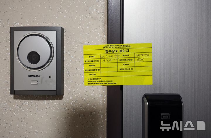 [서울=뉴시스] 이영환 기자 = 김건희 특검팀(특별검사 민중기)이 서울 노원구에 위치한 이준석 개혁신당의 대표 자택 압수수색에 나선 28일 오전 이 대표의 자택에 압수장소 봉인지가 붙어 있다. 2025.07.28. [email protected]