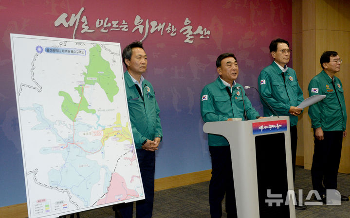 [울산=뉴시스] 배병수 기자 = 김두겸 울산시장이 28일 오전 시청 프레스센터에서 기자회견을 열고 최근 집중호후로 울주군 6개 읍면에서 단수사태가 벌어진 것과 관련해 사과와 함께 대책 마련에 적극 나설 것을 밝히고 있다. [email protected].