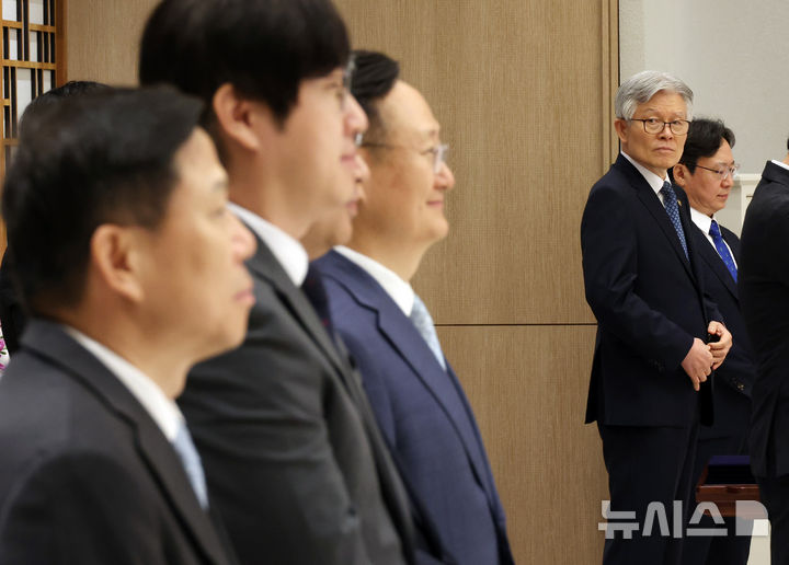 [서울=뉴시스] 최동준 기자 = 최동석 인사혁신처장이 28일 서울 용산 대통령실 청사에서 열린 신임 국무위원 및 국세청장 임명장 수여식에 참석해 있다. (대통령실통신사진기자단) 2025.07.28. [email protected]