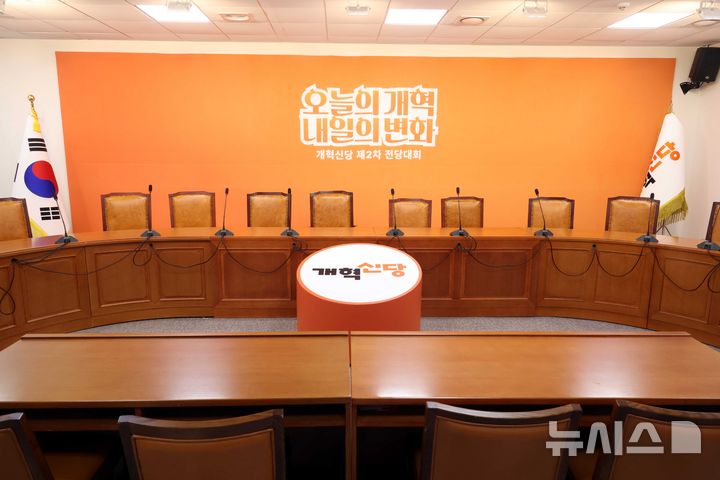 [서울=뉴시스] 조성봉 기자 = 김건희 특검이 이준석 개혁신당 대표 의원실 및 자택에 대한 압수수색에 나선 28일 오전 서울 여의도 국회 개혁신당 회의실에서 개최될 예정이었던 최고위원회가 긴급 취소되어 빈자리가 보이고 있다. 2025.07.28. [email protected]
