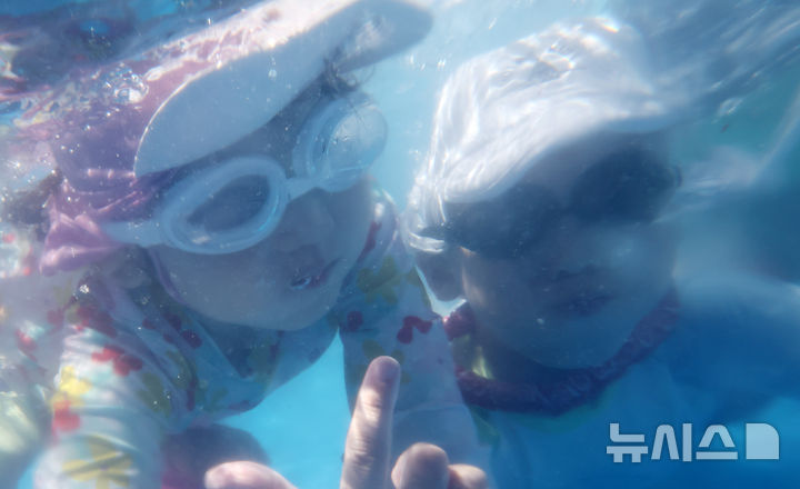 [부산=뉴시스] 하경민 기자 = 전국적으로 폭염이 기승을 부리고 있는 28일 부산 연제구청에 마련된 물놀이장을 찾은 어린이들이 잠수를 하며 더위를 식히고 있다.