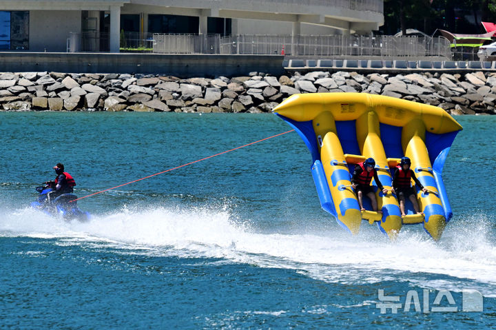 [남해=뉴시스] 차용현 기자 = 전국 대부분 지역에 폭염특보가 내려진 28일 오후 경남 남해군 상주은모래비치에서 피서객들이 플라잉피쉬보트를 타며 더위를 식히고 있다. 2025.07.28. [email protected]