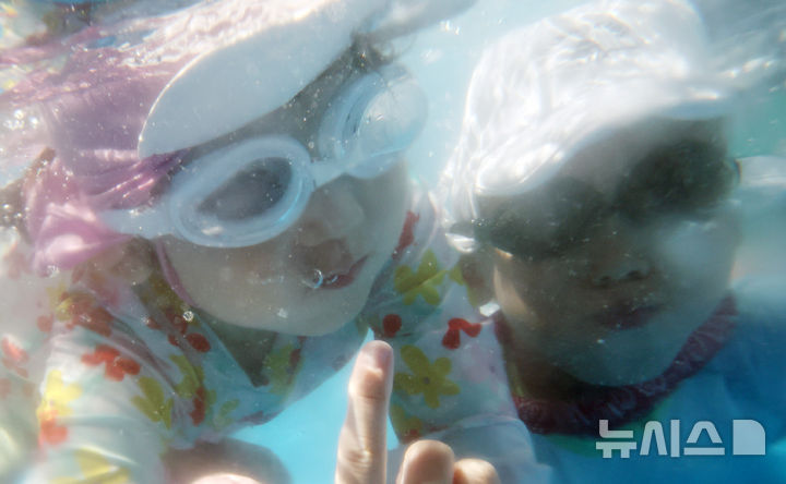 [부산=뉴시스] 하경민 기자 = 전국적으로 폭염이 기승을 부리고 있는 28일 부산 연제구청에 마련된 물놀이장을 찾은 어린이들이 잠수를 하며 더위를 식히고 있다.