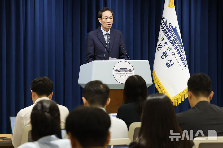 [서울=뉴시스] 최동준 기자 = 우상호 정무수석이 28일 서울 용산 대통령실에서 오는 8월 15일 광화문 광장에서 개최되는 '대통령 국민 임명식' 관련 브리핑을 하고 있다. 2025.07.28. [email protected]