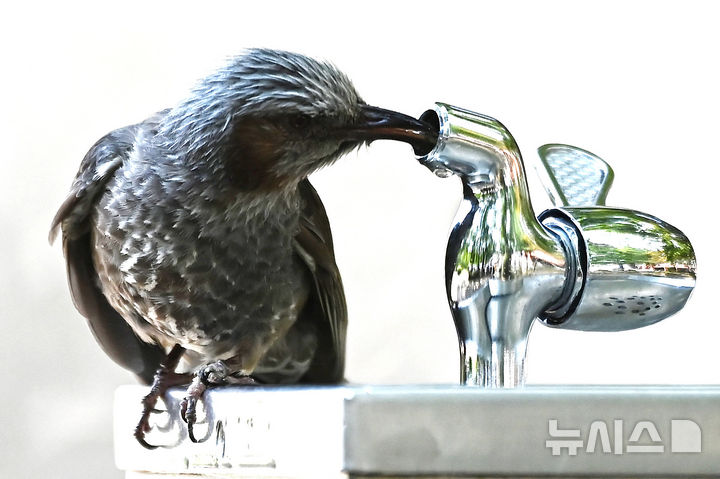 [수원=뉴시스] 김종택 기자 = 전국 곳곳에 폭염특보가 발효된 28일 경기 수원시 팔달구 올림픽공원에서 무더위에 지친 직박구리가 목을 축이고 있다. 2025.07.28. [email protected]