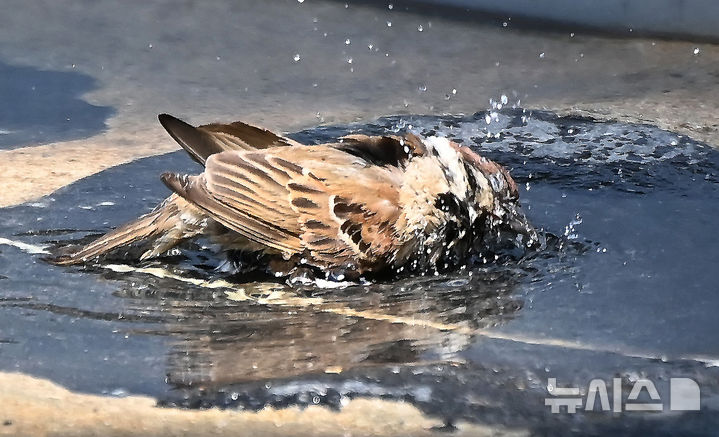 [수원=뉴시스] 김종택 기자 = 전국 곳곳에 폭염특보가 발효된 28일 경기 수원시 팔달구 올림픽공원에서 무더위에 지친 참새가 수돗가에서 목욕을 하며 더위를 식히고 있다. 2025.07.28. [email protected]