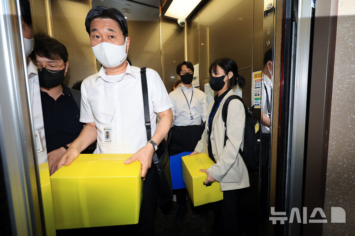 [서울=뉴시스] 이영환 기자 = 김건희 여사 관련 각종 의혹을 수사하는 김건희 특검팀(특별검사 민중기)이 28일 서울 노원구 상계동 이준석 개혁신당 대표 자택에서 압수수색을 마친 뒤 압수품을 옮기고 있다. (공동취재) 2025.07.28. [email protected]