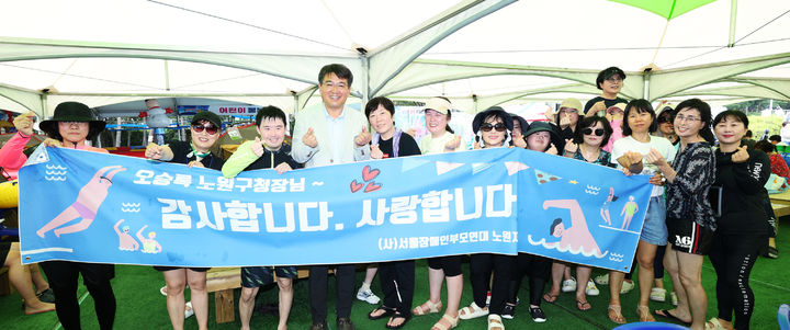 [서울=뉴시스] 황준선 기자 = 오승록 노원구청장이 28일 오전 서울 노원구 서울과학기술대학교 종합운동장에서 열린 ‘2025 노원 장애인가족과 함께하는 꿀잼 워터파크’를 찾아 참석자들과 기념촬영 하고 있다. (사진=노원구청 제공) 2025.07.28. [email protected] *재판매 및 DB 금지