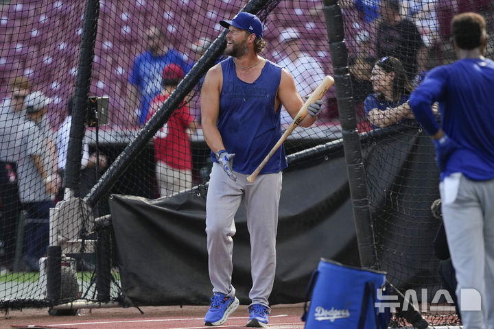 [신시내티=AP/뉴시스] LA 다저스 투수 클레이튼 커쇼가 28일(현지 시간) 미 오하이오주 신시내티의 그레이트 아메리칸 볼파크에서 열리는 2025 메이저리그 신시내티 레즈와의 경기에 앞서 타격 연습을 하면서 타구를 바라보고 있다. 커쇼는 이날 경기에는 나서지 않는다. 2025.07.29.