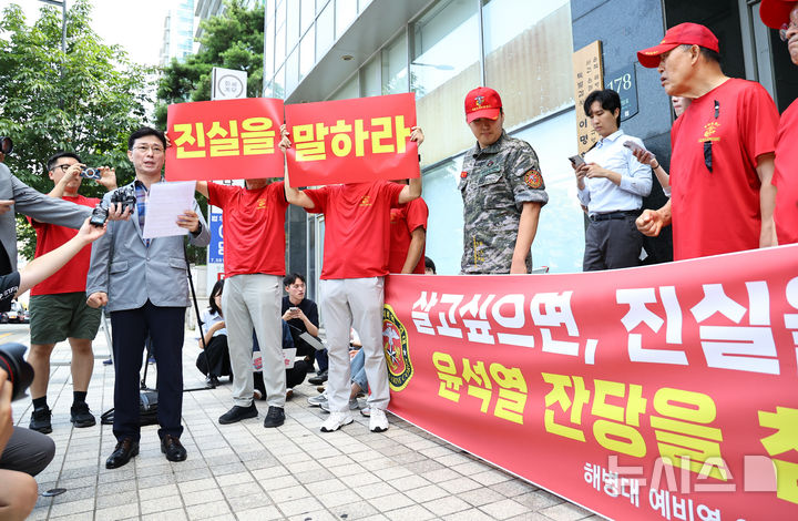[서울=뉴시스] 최진석 기자 = 임성근 전 해병대 1사단장이 29일 오전 서울 서초구 이명현 순직 해병 특별검사 사무실 앞에서 '신속한 결정 요청서' 제출에 앞서 발언하고 있다. 2025.07.29. [email protected]