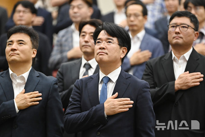 [수원=뉴시스] 김종택 기자 = 박재억 신임 수원지방검찰청 검사장이 29일 경기 수원시 영통구 수원지검 대강당에서 열린 제46대 검사장 취임식에서 국민의례를 하고 있다. 2025.07.29. [email protected]