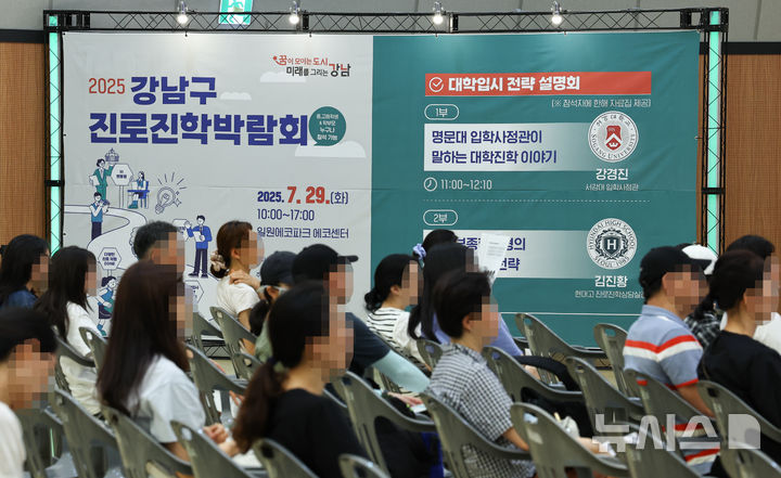 [서울=뉴시스] 최진석 기자 = 29일 서울 강남구 일원에코파크 에코센터에서 열린 '2025 강남구 진로진학 박람회'를 찾은 학생과 학부모들이 대학입시 전략 설명을 듣고 있다. 2025.07.29. [email protected]