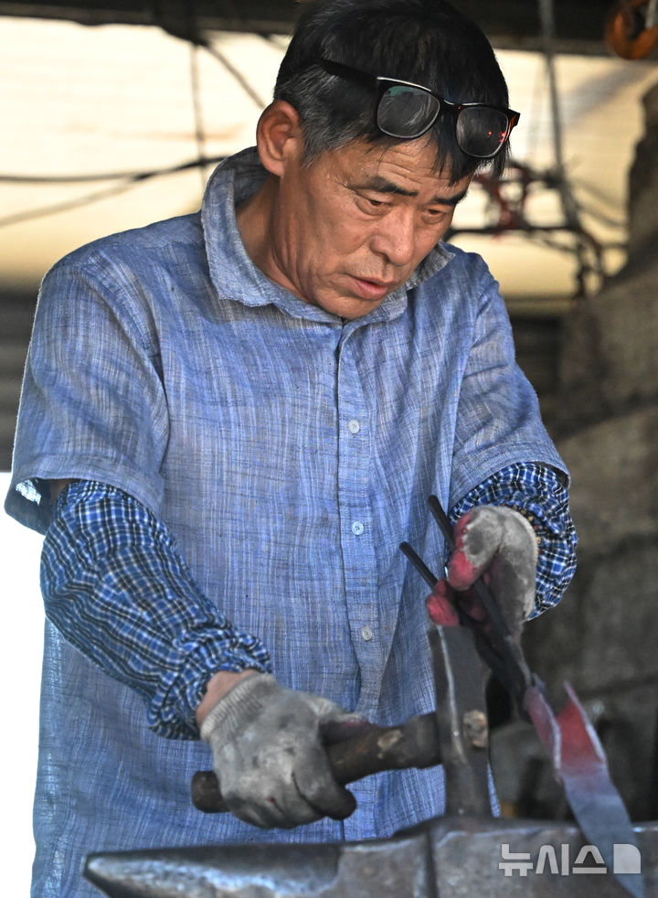 [광주=뉴시스] 이영주 기자 = 광주지역 최고기온이 36.6도에 달한 29일 오후 광주 광산구 송정대장간에서 최종호(61) 송정대장간 대표가 망치와 모루를 이용해 약초를 캐는 도구를 만들고 있다. 광주지역에는 지난 20일 이후 현재까지 열흘 동안 폭염특보가 이어지고 있다. 2025.07.29. [email protected]
