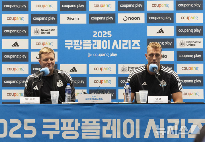 [서울=뉴시스] 김근수 기자 = 영국 프리미어리그 뉴캐슬 유나이티드 댄번(오른쪽)이 29일 서울 여의도 IFC몰에서 열린 쿠팡시리즈 1차전 대비 프리 기자회견에서 취재진 질문에 답하고 있다.