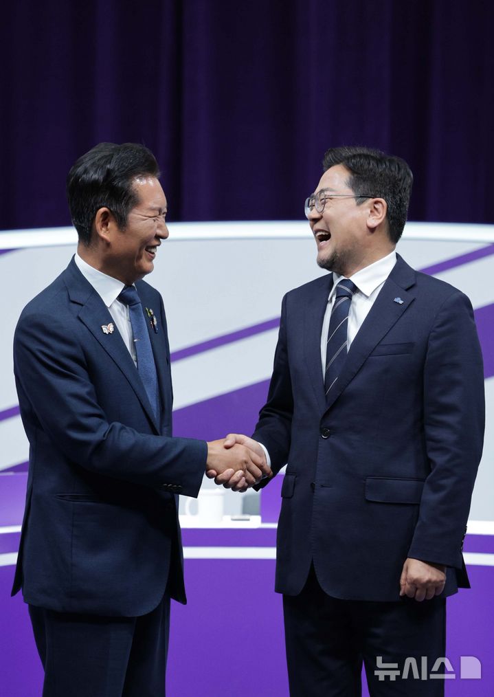 [서울=뉴시스] 국회사진기자단 = 정청래(왼쪽), 박찬대 더불어민주당 당대표 후보가 29일 오후 서울 마포구 MBC에서 열린 TV토론회에서 악수를 하고 있다. 2025.07.29. [email protected]