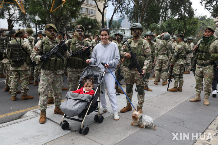 [리마=신화/뉴시스] 29일(현지 시간) 페루 리마에서 열린 페루 독립 제204주년 기념 퍼레이드에 앞서 한 여성이 군인들과 함께 사진을 찍고 있다. 페루는 아르헨티나 출신 호세 데 산마르틴 장군이 1821년 7월 28일 리마에 입성해 스페인으로부터 독립을 선언한 것을 기념한다. 2025.07.30.