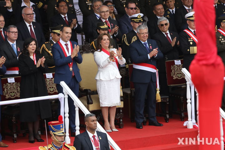 [리마=신화/뉴시스] 디나 볼루아르테(가운데) 페루 대통령이 29일(현지 시간) 리마에서 열린 페루 독립 제204주년 기념 퍼레이드를 보면서 박수하고 있다. 페루는 아르헨티나 출신 호세 데 산마르틴 장군이 1821년 7월 28일 리마에 입성해 스페인으로부터 독립을 선언한 것을 기념한다. 2025.07.30.