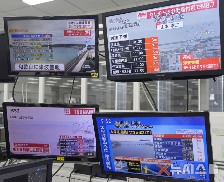 [오사카=AP/뉴시스] 30일(현지 시간) 러시아 캄차카반도 인근 해상에서 강진이 발생해 일본 일부 지역에 쓰나미 경보가 발령된 가운데 오사카의 TV에서 쓰나미 경보 속보를 전하고 있다. 2025.07.30.
