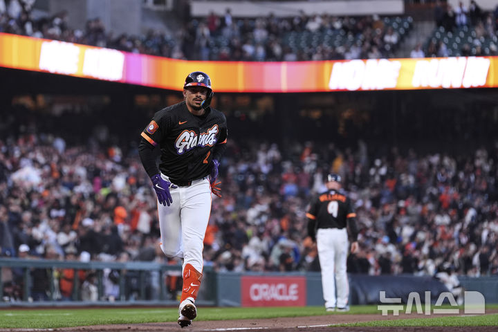 [샌프란시스코=AP/뉴시스] 샌프란시스코 자이언츠의 윌리 아다메스가 29일(현지 시간) 미 캘리포니아주 샌프란시스코 오라클 파크에서 열린 2025 메이저리그 피츠버그 파이리츠와의 경기 4회 말 1점 홈런을 친 후 베이스를 돌고 있다. 이날 이정후는 3타수 무안타를 기록했고 샌프란시스코는 2안타 빈공에 허덕이며 1-3으로 패했다. 2025.07.30.