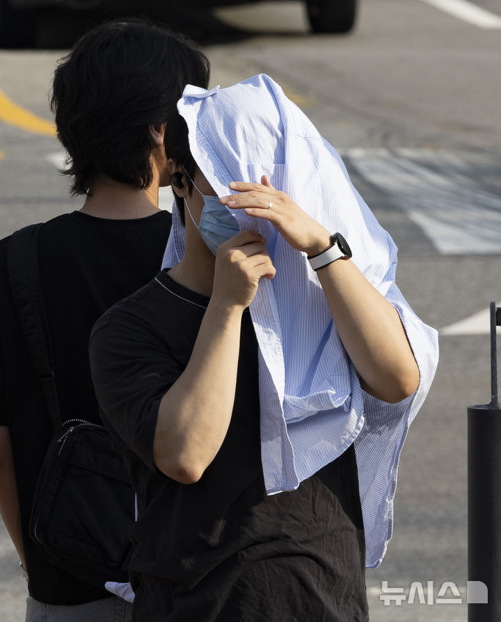 [서울=뉴시스] 김근수 기자 = 기록적인 폭염이 이어진 30일 오전 서울 서초구 고속버스터미널 인근에서 한 시민이 겉옷으로 햇볕을 가리며 출근길에 나서고 있다. 2025.07.30. [email protected]