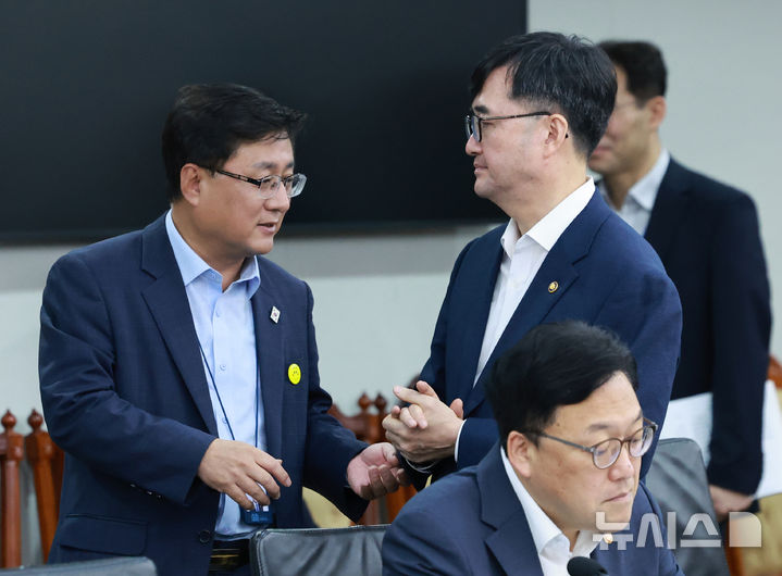 [서울=뉴시스] 고범준 기자 = 김성환 환경부 장관과 임기근 기획재정부 2차관이 30일 서울 용산 대통령실 청사에서 열린 비상경제점검 태스크포스(TF) 3차회의에서 대화를 나누고 있다. (대통령실통신사진기자단) 2025.07.30. [email protected]
