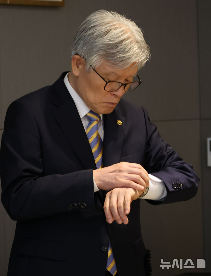 [세종=뉴시스] 강종민 기자 = 최동석 인사혁신처장이 30일 세종시 정부세종청사에서 열린 차관급 임명장 수여식에 참석, 시간을 확인하고 있다. 2025.07.30. [email protected]