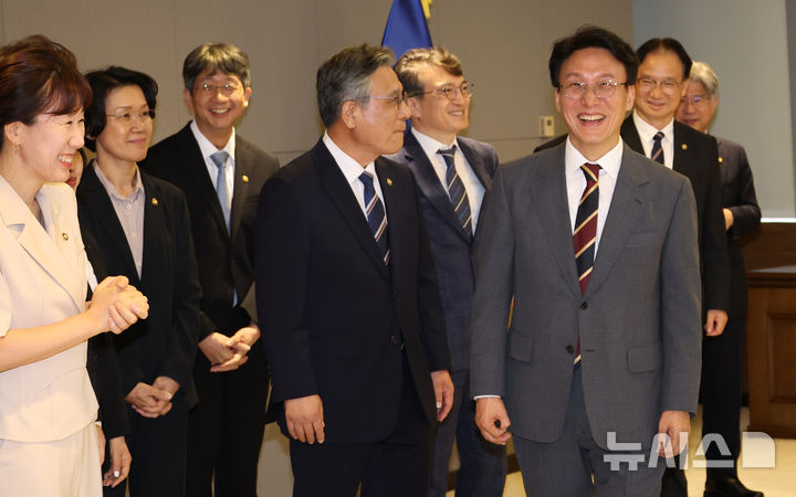 차관들과 밝은 표정 짓는 김민석 총리